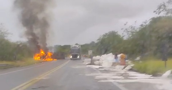 BOA NOVA: Carreta tomba e pega fogo às margens da BR-116.