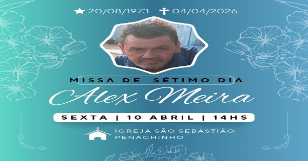 A família de Alex Meira dos Santos, convida parentes e amigos para a Missa de Sétimo Dia em sua memória.
