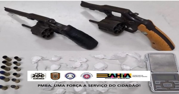 Material apreendido:02 revólveres (calibres .38 e .32),06 cartuchos intactos e 07 deflagrados, 01 balança de precisão,20 porções de substância análoga à cocaína.