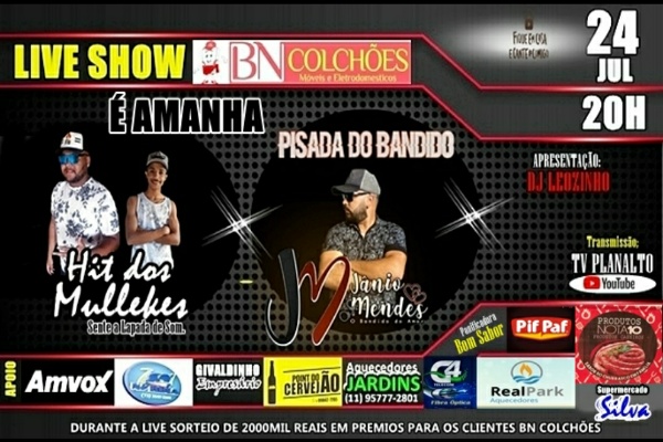 Nessa sexta-feira (24),acontece a primeira ‘Live Show BN Colchões’ ,o evento é uma realização da Loja BN Colchões Móveis e Elétrons,juntamente com a Farmácia Sande. Teremos a apresentação do cantor Jânio Mendes com a participação da banda Hits dos Mullekes.Durante a Live teremos o sorteio,com um Show de Prêmios exclusivos para Clientes BN Colchões,além de ser uma Live Solidária em prol da construção da casa da amiga Adevanir Maria de Jesus.