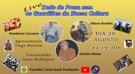Acontece neste sábado (29), a Live Dedo de Prosa com os Guardiões da Nossa Cultura. A live que terá a apresentação do Locutor Thiago Moreira, conta com as participações dos professores e Guardiões da Cultura Bonjesuense,Humberto Carneiro, Gilson Bonfim e Orônio Nunes.