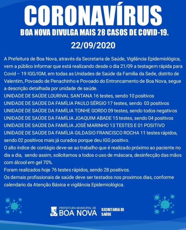 BOA NOVA: 28 profissionais da Saúde testam positivo para o Covid-19.