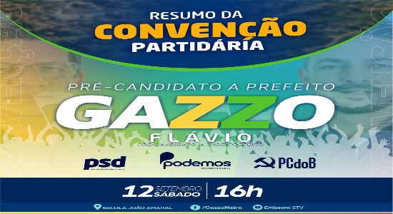 Acontece neste sábado (12), a Convenção Partidária do grupo do pré-candidato a prefeito Gazzo,onde oficializará as candidaturas do prefeito, vice e dos vereadores nas eleições 2020. A coligação será composta por três partidos, sendo o PSD, PODEMOS e PCdoB. A convenção será transmitida ao vivo a partir das 16 horas pelo canal da STV no YouTube e pelo Facebook oficial do prefeito – www.facebook.com/prefeitogazzomeira