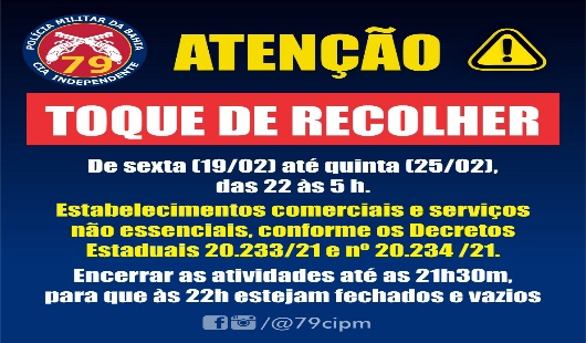 Com o Decreto Estadual 20.233/21 e n°20234/21 fica válido o ‘Toque de Recolher’ para 343 municípios do estado a partir dessa sexta-feira (19), o decreto terá validade entre os dias 19/02 e 25/02 das 22h às 05h da manhã , estabelecimentos comerciais e não essenciais deverão encerrar suas atividades às 21:30hs.
