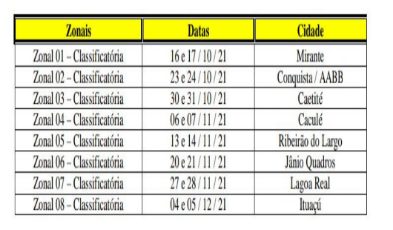 Confira abaixo as datas dos Zonais que acontecerão, além de Mirante, nas cidades de Vitória da Conquista, Caetité, Caculé, Ribeirão do Largo, Jânio Quadros, Lagoa Real e Ituaçu.