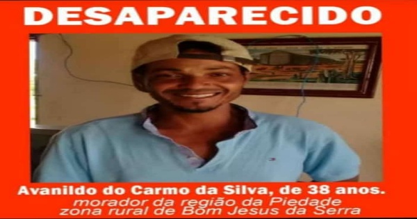 Avanildo do Carmo da Silva, de 38 anos morador da região da Piedade zona rural de Bom Jesus da Serra está desaparecido desde o último dia 11/10, segunda informações de familiares o mesmo foi visto ás 06h da manhã de segunda feira 11, saindo da sua residência com uma espingada falando que iria caçar, mais até o exato momento não retornou para casa deixando sua família desesperada. Familiares estão fazendo busca para encontra-lo. Quem souber de qualquer informações entrar em contatos com família pelo tel: 77 8845-8757 (Selma) 77 98032-4570 (Edite).