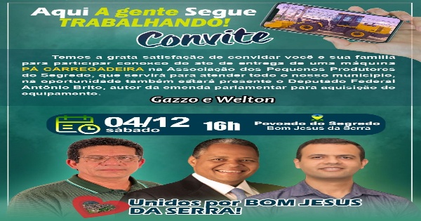 A Associação dos Pequenos Produtores do Segredo, região rural de Bom Jesus da Serra, foi beneficiada com uma Pá Carregadeira através de emenda parlamentar do deputado federal Antônio Brito, que é apoiado pelo grupo do ex-prefeito Gazzo no município bom-jesuense. O equipamento deve ser entregue aos associados no próximo dia 04 de dezembro na região do Segredo a partir das 16h.