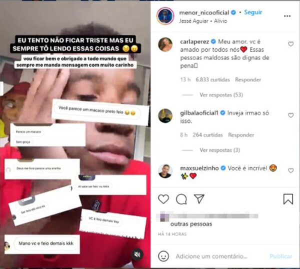 Menor Nico tem sido alvo constante de racismo nas redes sociais. Na segunda-feira (29), ele compartilhou algumas mensagens com insultos raciais, que recebeu.
