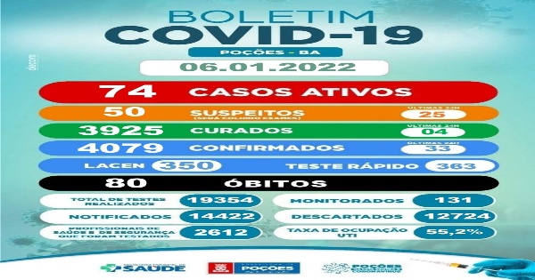 O município de Poções que contava com  45 casos ativos nessa última quarta-feira,registrou 29 novos casos nessa quinta-feira (06/01), o total de 4079 casos confirmados da Covid-19. Destes, 3925 estão recuperados e 74 continuam em recuperação.