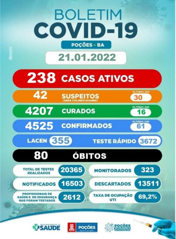 O município de Poções registrou 45 novos casos ativos do Covid-19 nas últimas 24 horas, até esta sexta-feira (21/01), o total de 4525 casos confirmados da Covid-19. Destes, 4207 estão recuperados e 238 continuam em recuperação.