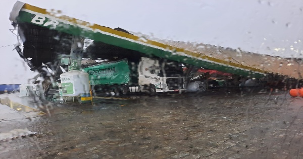 POÇÕES: Forte chuva acompanhada de vento derruba cobertura de Posto de Combustível da Cidade.
