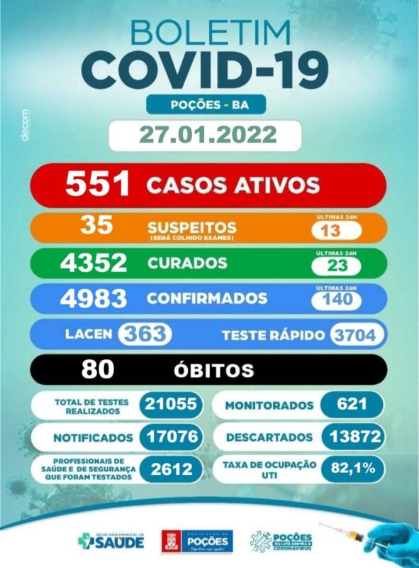 O município de Poções registrou, até esta quinta-feira (27/01), o total de 4983 casos confirmados da Covid-19. Destes, 4352 estão recuperados e 551 continuam em recuperação.
