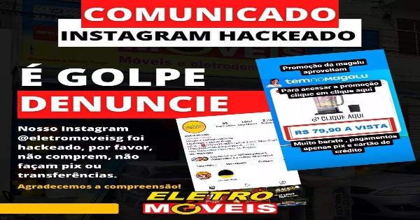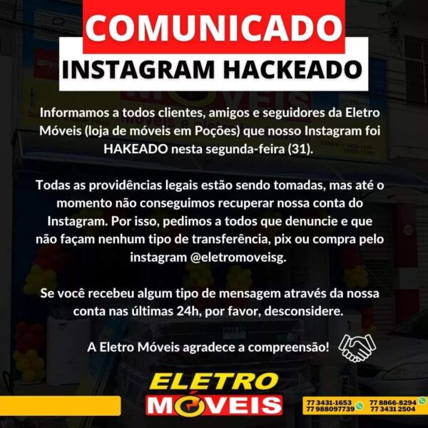 Nessa terça-feira (01), a Eletro Móveis, loja de venda de móveis da cidade de Poções, teve sua conta do Instagram hackeada por criminosos que estão tentando aplicar golpes. Os bandidos estão usando a rede social para expor móveis com preços atraentes e efetuar vendas online. O caso será registrado na delegacia de Polícia Civil nesta quarta-feira (02).