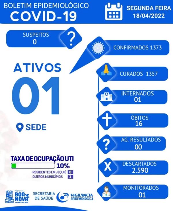 Na noite dessa última segunda-feira (19),após 34 dias, Boa Nova voltou a registrar um caso ativo da covid-19. Trata – se um paciente residente na sede do municipio.Confira o Boletim Epidemiológico Atualizado: