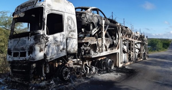Um caminhão-cegonha, carregado com 11 veículos novos, pegou fogo na manhã desta quinta-feira (21), na BR-116. O caso aconteceu próximo ao povoado de Formosa, que fica na zona rural do município de Macururé, no norte da Bahia.