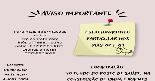 O estacionamento estará funcionando no fundo do posto de saúde, ao lado da construção de Kinha e Iraemes.
