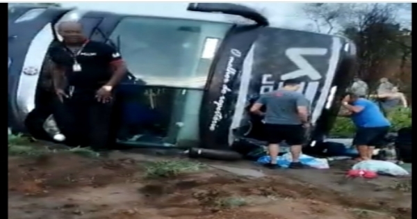O ônibus do cantor Kevi Jonny capotou na BR-324, na tarde desta sexta-feira (11), nas proximidades de Cristópolis, no interior da Bahia. De acordo com a assessoria do artista, “estão todos bem”.