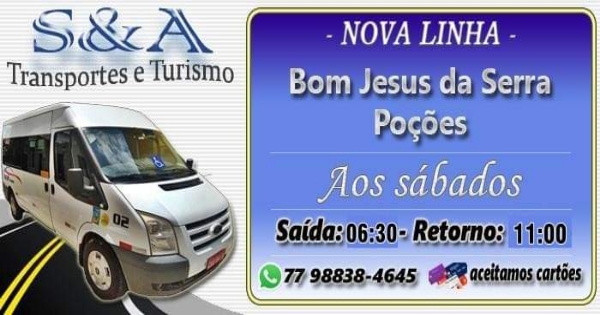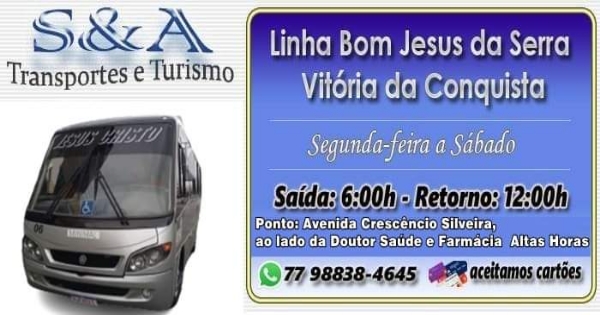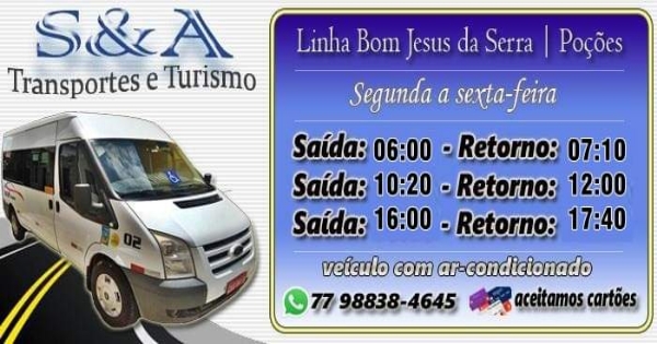 Com linhas diárias Bom Jesus da Serra – Poções e Bom Jesus da Serra – Vitória da Conquista, além de viagens turísticas,aceitando cartões de créditos a S&A Transportes proporciona os melhores preços.