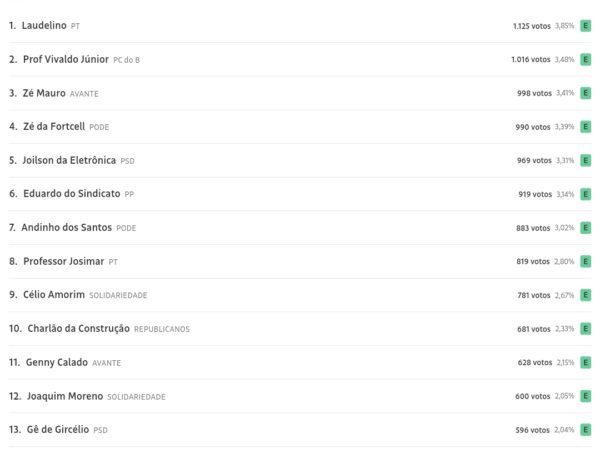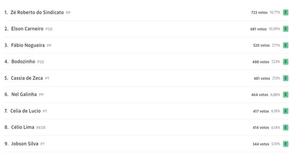 Agora com nove vereadores, a Câmara Municipal da legislatura 2025/2028 será formada pelos seguintes nomes: Juniel do Tanquinho / PP (eleito com 988 votos), Gueu de Janin / PSD (reeleito com 588 votos), Bena do Açougue / MDB (eleito com 516 votos), Iago Moraes / PSD (eleito com 506 votos), Jardel / PC do B (reeleito com 430 votos), Genilson do Sindicato / PC do B (reeleito com 406 votos), Romilson Cabeludo / AGIR (eleito com 398 votos ), Valder Botelho / MDB (eleito com 353 votos) e Claúdio Cabeleireiro / PP (eleito com 252 votos).
