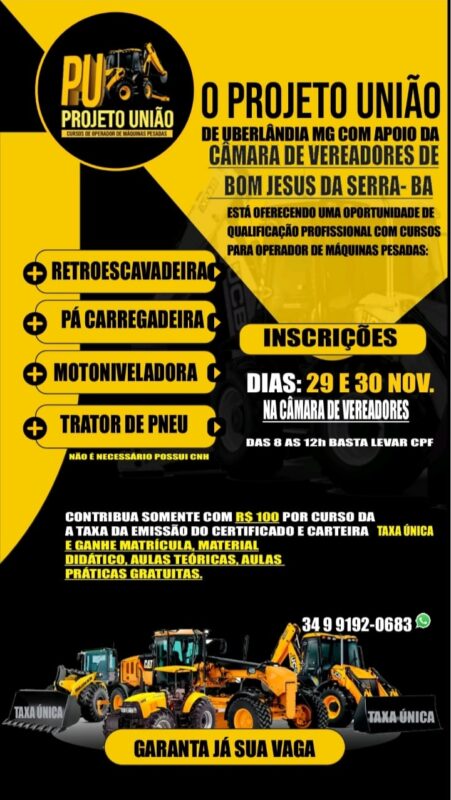 BOM JESUS DA SERRA: Projeto União com apoio da Câmara de Vereadores oferece cursos gratuitos na área de Operador de Máquinas Pesadas; Faça já sua inscrição!