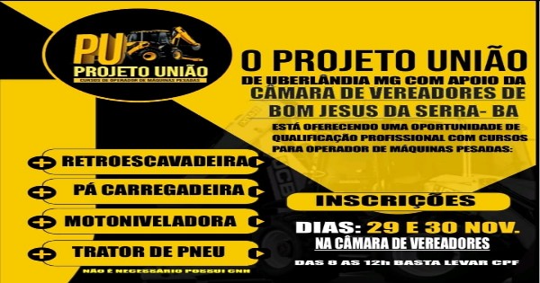 O Projeto União de Uberlândia MG com apoio da CÂMARA DE VEREADORES DE BOM JESUS DA SERRA está oferecendo uma oportunidade de qualificação profissional com Cursos para Operador de Máquinas Pesadas:
