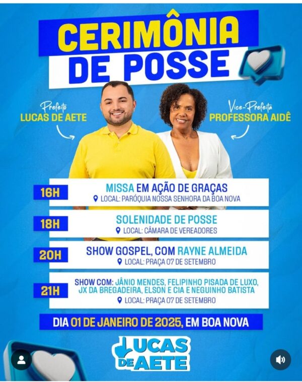 No próximo dia 1º de janeiro de 2025,acontece a cerimônia de posse do Prefeito Eleito de Boa Nova,Lucas de Aete, sua vice, Professora Aidê, dos vereadores e secretários municipais.