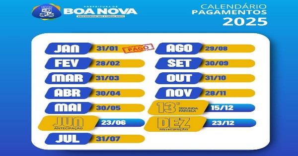 Reafirmando o seu compromisso com a transparência e a valorização dos servidores municipais,a Prefeitura Municipal de Boa Nova divulgou oficialmente nesta sexta-feira (31),o calendário anual de pagamento para o ano de 2025.