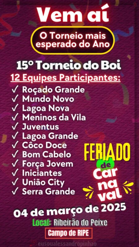 Acontece no próximo dia 04 de Março, Feriado de Carnaval, a 15° Edição do Tradicional Torneio do Boi, realizado anualmente no Campo de Ripe na região do Ribeirão do Peixe, Zona Rural do município de Bom Jesus da Serra.