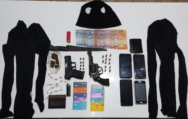 A dupla foi baleada e socorrida até uma unidade hospitalar, mas não resistiu aos ferimentos. Com os suspeitos, foram apreendidos uma pistola, um revólver, uma faca, drogas e tocas ‘brucutu’. Foram recuperados aparelhos celulares roubados, cartões de crédito e uma pequena quantidade em dinheiro.
