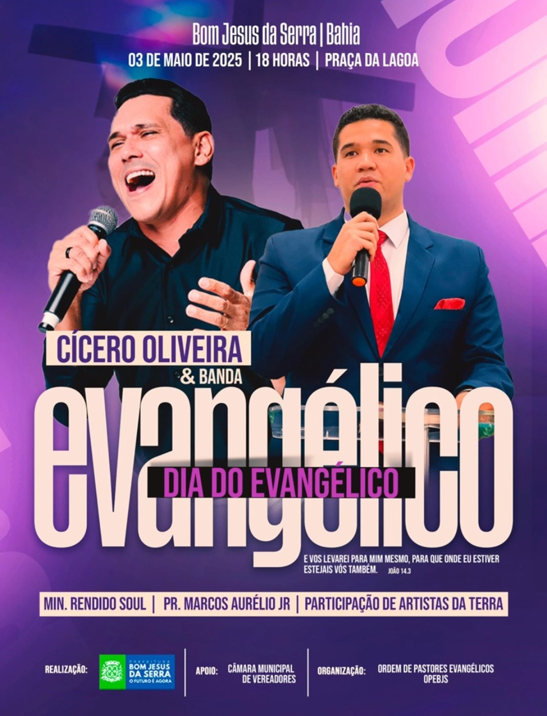 O evento que é uma realização da Prefeitura Municipal de Bom Jesus da Serra e conta com a organização da Ordem de Pastores Evangélicos, acontecerá na Praça da Lagoa a partir das 18:00H e terá a participação das seguintes atrações: Cícero Oliveira e Banda, Min. Rendido Soul, Pr. Marcos Aurélio Jr e Artistas da Terra.