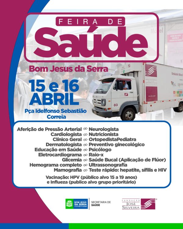 A Secretaria Municipal de Saúde,junto a Prefeitura Municipal de Bom Jesus da Serra em parceria com a Fundação José Silveira, estará realizando a VIII Feira de Saúde no município nos dias 15 e 16 de abril!