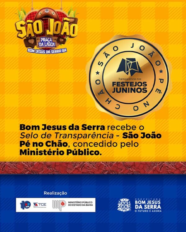 A Prefeitura de Bom Jesus da Serra recebeu na manhã desta terça-feira (10),o Selo de Transparência dos Festejos Juninos de 2025, São João Pé no Chão, concedido pelo Ministério Público. Um reconhecimento importante pelo esforço da gestão em manter tudo claro para a população. Seguindo firme no compromisso com o povo.