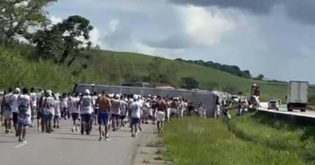 URGENTE: Ônibus com torcida organizada do Bahia capota e deixa vários feridos na BR-101.