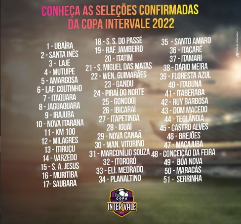 A Copa Inter Vale 2022 está prevista para começar no dia 06 de março. Paralisada desde de 2020, devido à pandemia de Covid-19, a segunda maior competição do futebol amador da Bahia chega a sua sétima edição e já tem 50 seleções de cidades espalhadas por diversas regiões da Bahia.