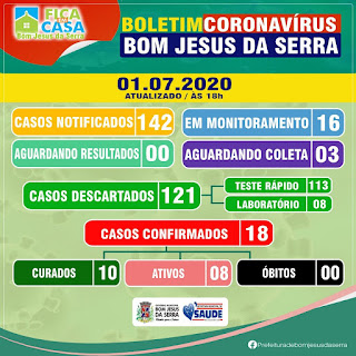 A Secretária Municipal de Saúde comunica a toda população Bonjesuense, que foram confirmados nesta quarta-feira 01/07 mais 03 casos positivos para COVID-19 no município, totalizando 18 casos confirmados, 10 estão curados. Resultados através de testagem com Teste Rápido, todos seguem em isolamento domiciliar, sendo como fazer um blog monitorados pela Vigilância Epidemiológica. De acordo com o novo boletim, já foram notificados no municipio 142 pessoas, 03 pacientes estão com suspeita, 121 foram descartados, 18 deu positivo. A prefeitura pede que a população tenha ainda mais cuidado, pois os casos estão aumentando no município.